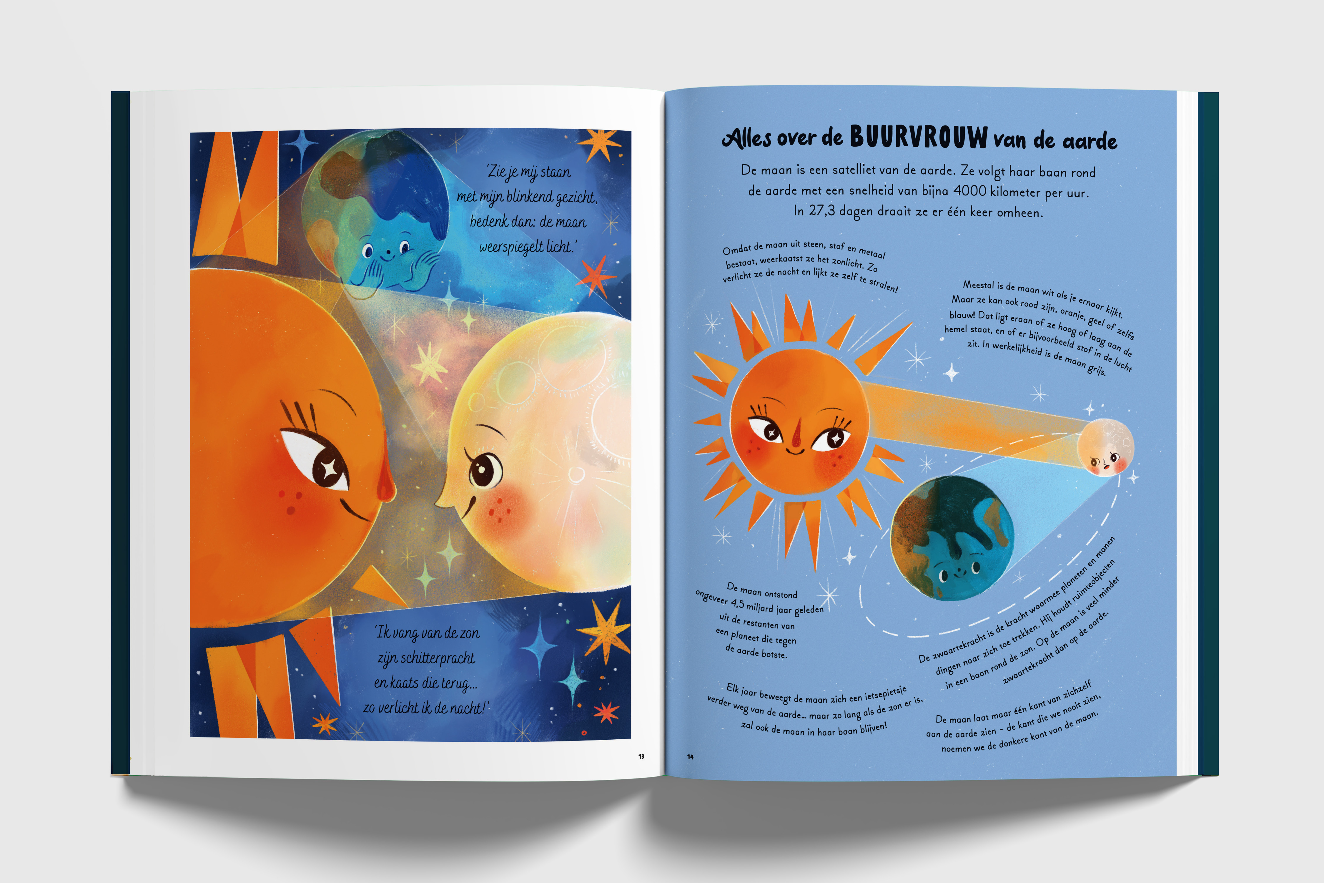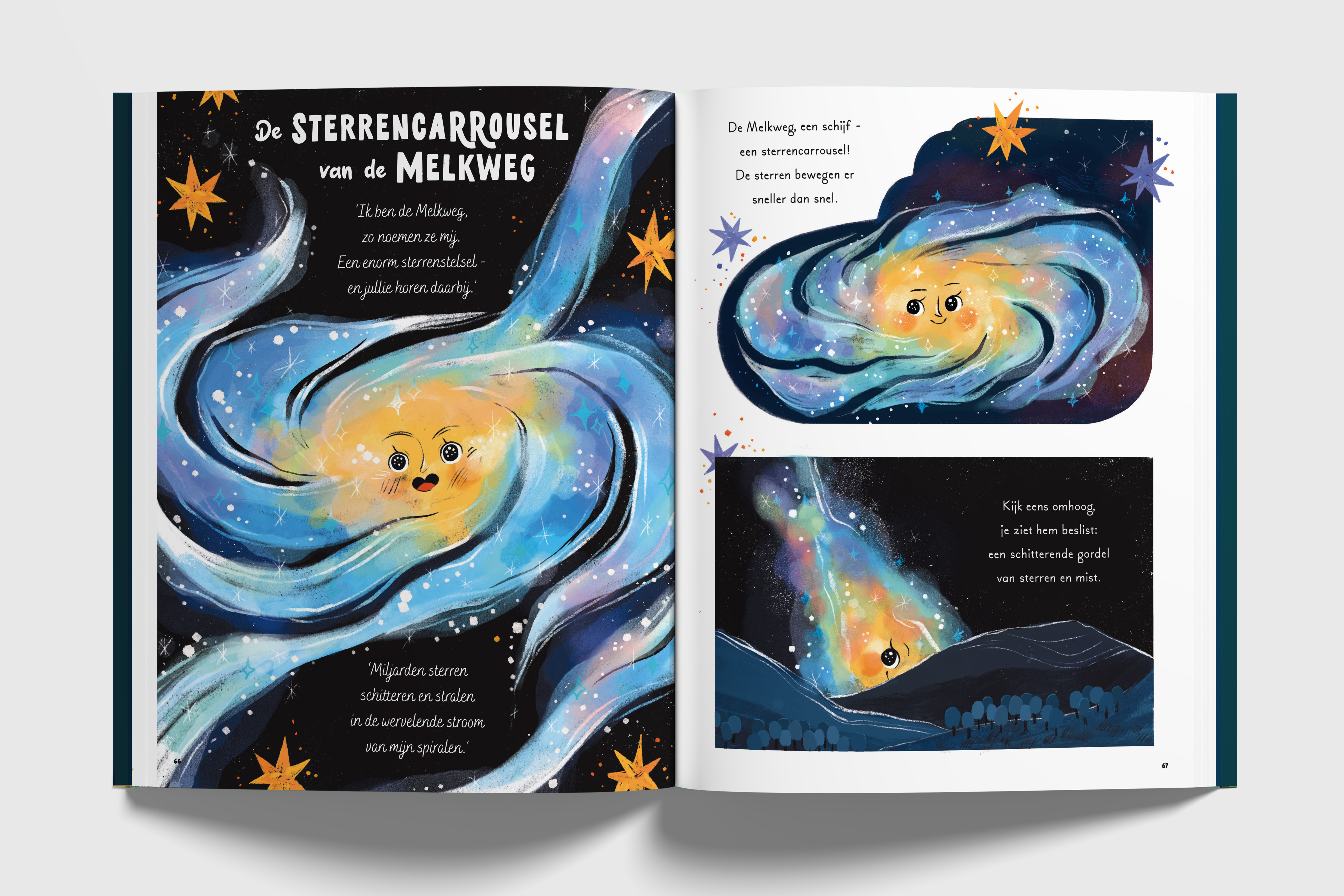 'Een speelse ontdekkingsreis voor kinderen door het wijde heelal aan de hand van negen korte verhalen. Dit boek biedt een ontdekkingsreis door het heelal, waarbij lezers meer te weten komen over sterren, planeten en andere verschijnselen in de nachthemel. Na ieder verhaaltje volgt een pagina met informatie over de sterren en planeten. In zachtaardige, leerzame stijl en op rijm geschreven. Met sfeervolle en lichtvoetige kleurenillustraties.'- Biblion
